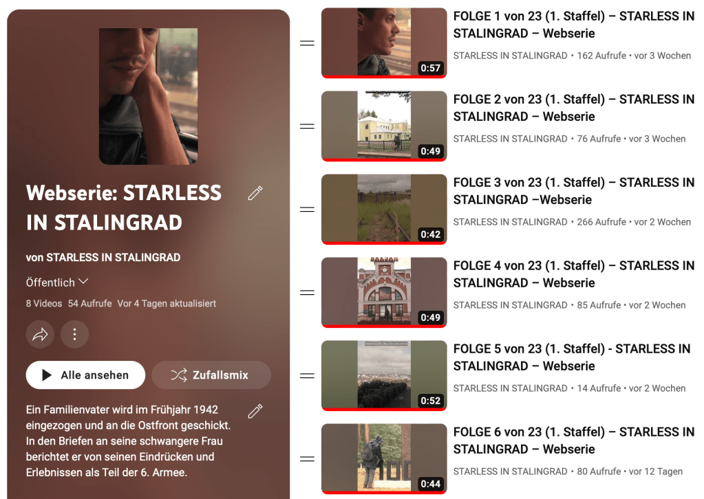 Weihnachten 2022 haben wir STARLESS IN STALINGRAD als Webserie gestartet! Seitdem werden die Episoden der 1. Staffel auf verschiedenen social media-Kanälen veröffentlicht.